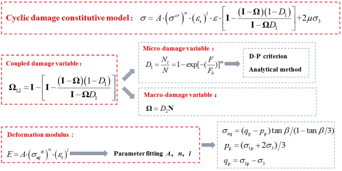节理岩体循环动态本构模型是国际岩石力学与工程领域的一个重要难题,现有的研究仅有针对节理岩体的静态本构模型,以及针对完整岩石的循环动态本构模型。课题组近期发表于Int. J Rock Mech. Min. Sci.的论文,根据Lemaitre应变等效原理及断裂力学理论求解复杂构型节理岩体耦合损伤变量,基于Weibull分布的岩石损伤软化模型和内变量疲劳本构关系,建立了国际上首个节理岩体循环加卸载动态损伤本构模型。该模型物理意义明确,综合考虑了宏观节理和微观裂隙的耦合损伤,经物理实验验证,这一本构模型能准确描述循环加卸载过程中节理岩体变形的曼辛效应和棘轮效应,有效反映复杂动荷载作用下节理岩体的非线性循环加卸载动态响应特征。