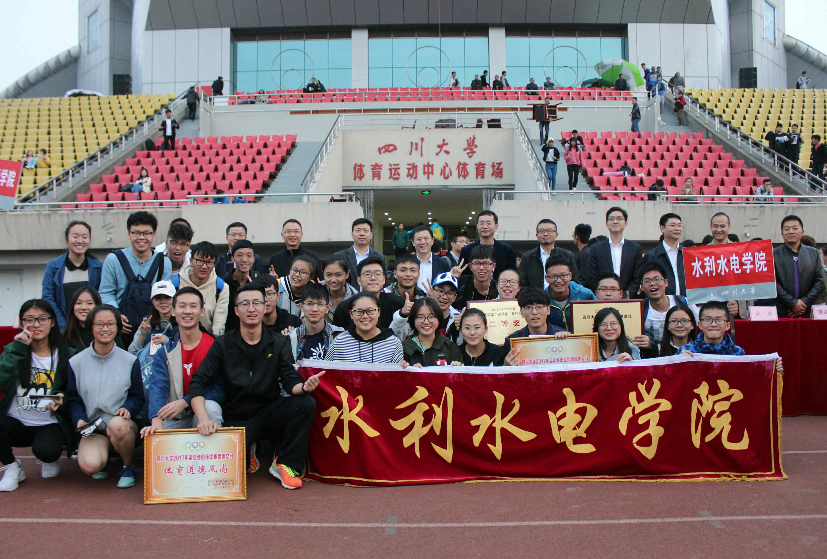 本次运动会中,水电健儿们奋勇拼搏,团结一致,取得了巨大的进步与骄人的成绩。团体项目中,我院获得男子异程接力第二名,20人21足比赛第三名,混合引体向上第五名,20*60m接力赛第九名,男子4*100m第十三名,混合立定跳远第十六名。个人项目中,我院涌现出一大批运动新秀,颇富经验的老运动员们也在继续为学院增光添彩。其中,研究生费云龙和大四王媛同学更是分别取得了男子跳高第二名和女子铅球第二名的好成绩。最终,我院荣获2017运动会田径比赛总分第十名、四川大学体育工作先进单位二等奖、四川大学学生运动会“最佳组织奖二等奖”、四川大学2017运动会田径比赛团体总分体育道德风尚奖。