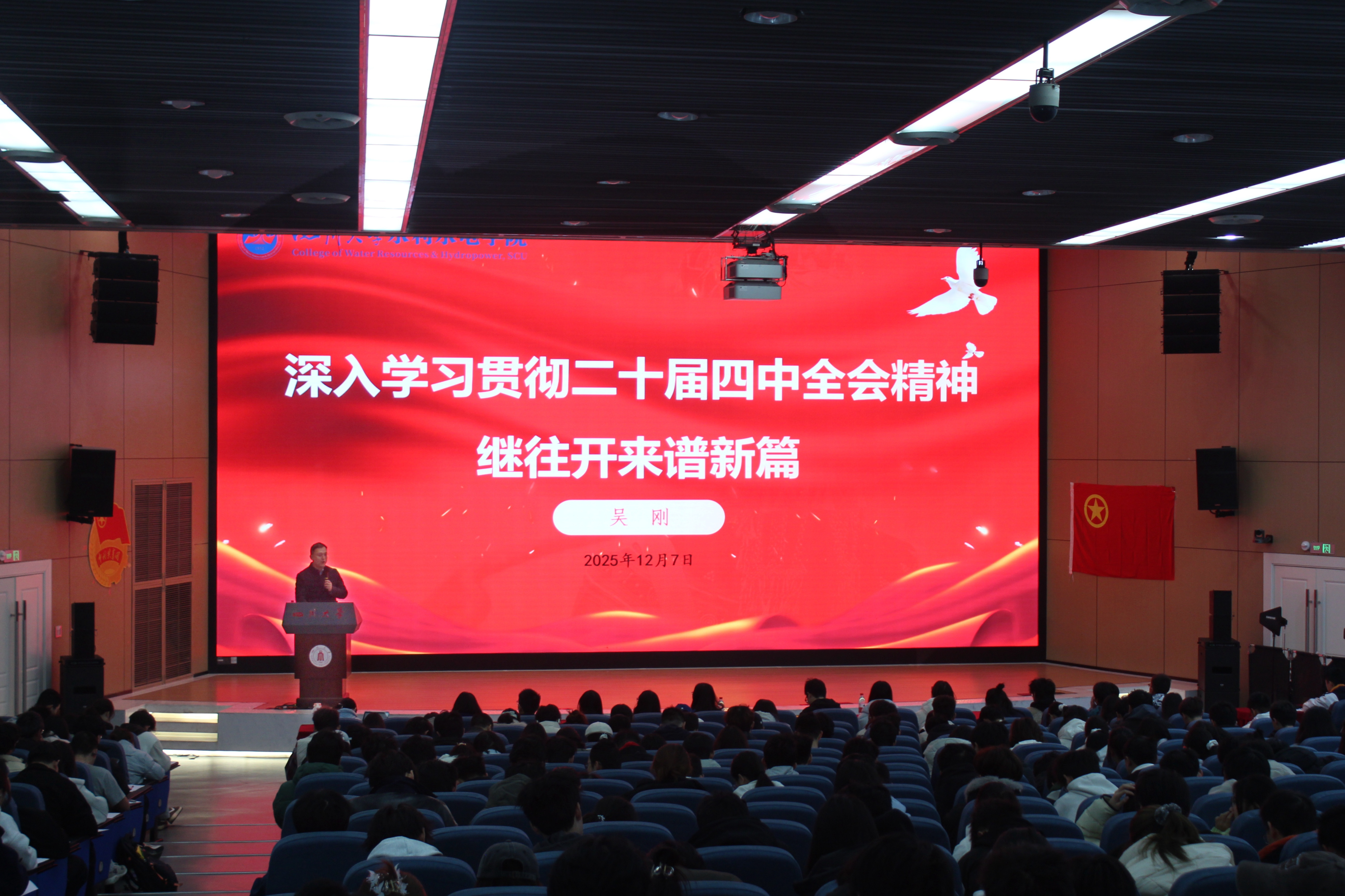 12月7日上午,四川大学英国上市公司3652025-2026学年团校第四次行课暨结业典礼在江安校区顺利举行。本次活动以“深入学习贯彻二十届四中全会精神,继往开来谱新篇”为主题,旨在激励水利学子肩负时代使命,投身国家水利事业,特邀学院党委书记吴刚老师主讲。学院团委指导老师毛英翥及2025级全体本科学生参会。